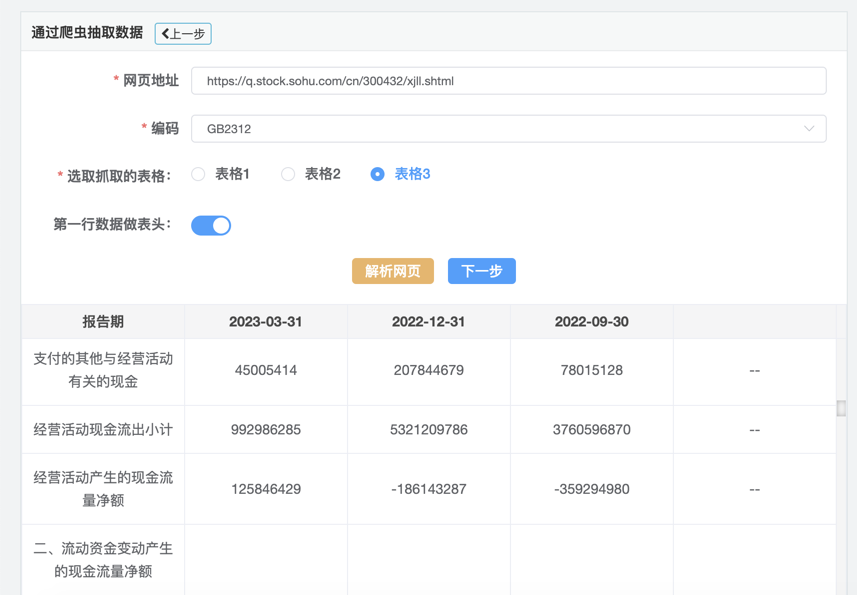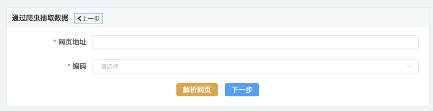 1.在数据抽取页面点击通过爬虫抽取数据菜单,系统进入爬虫定义界面,如下图:2.录入需要抓取的网页地址,设置正确的页面编码,点击解析网页按钮,系统出现表格选择选项卡,让用户选择需要解析的表格,如下图:3.选择完成后,点击下一步,进入爬虫配置页面,如下图:4.选择目标表,也可以新建目标表,来存储数据,设置字段映射内容,录入任务节点名称,点击保存按钮保存配置信息,点击执行按钮抽取数据到目标表中。
