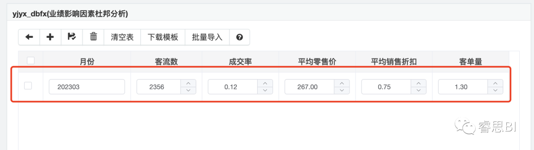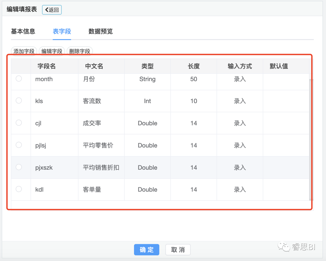 在数据填报功能中创建杜邦分析数据表,表字段如下图: