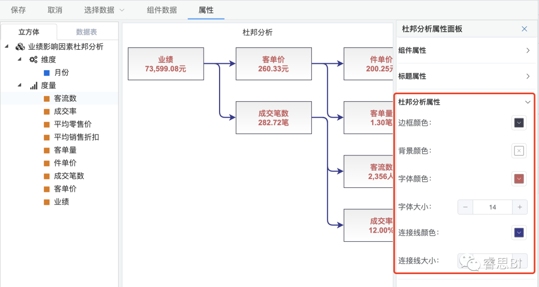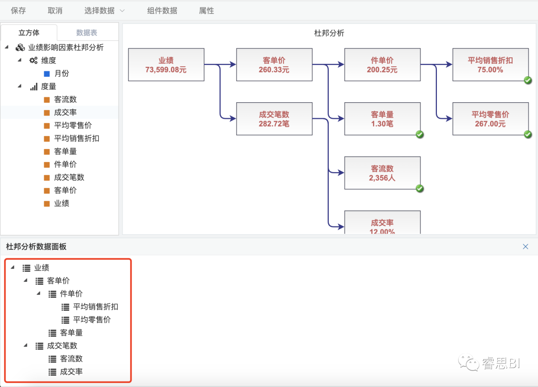 1.在仪表盘中点击分析图-新建分析图-杜邦分析菜单,为仪表盘页面添加杜邦分析分析图,然后选择刚才建的模型,把度量拖放到仪表盘数据面板中。