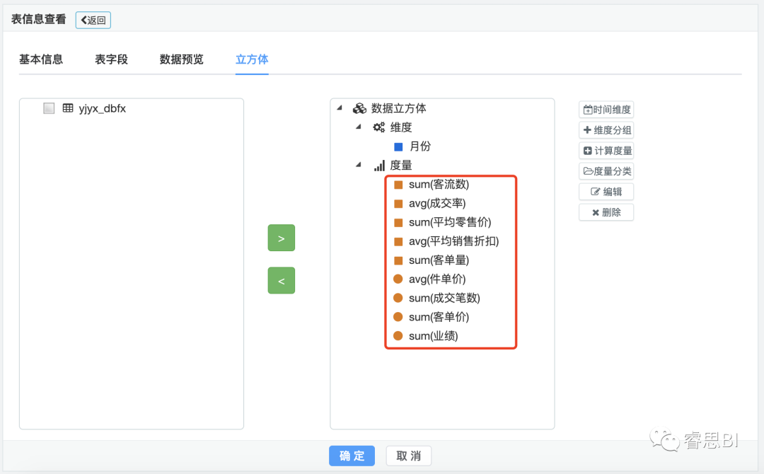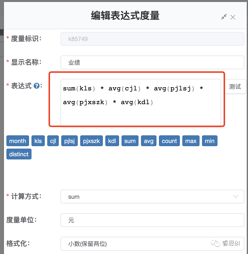 其中件单价、成交笔数、客单价、业绩都是计算指标,通过公式运算得出,以业绩指标为例配置如下图: